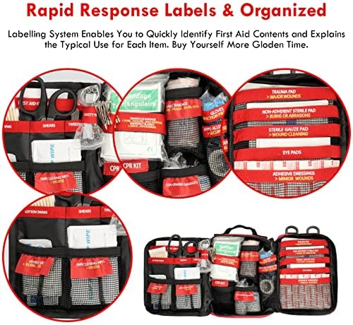 2022 New Upgrade first aid kit with labeling system, each inner sleeve is organized by category. During times of need, get to right items quickly. After items are used, easily see what needs to be replaced.